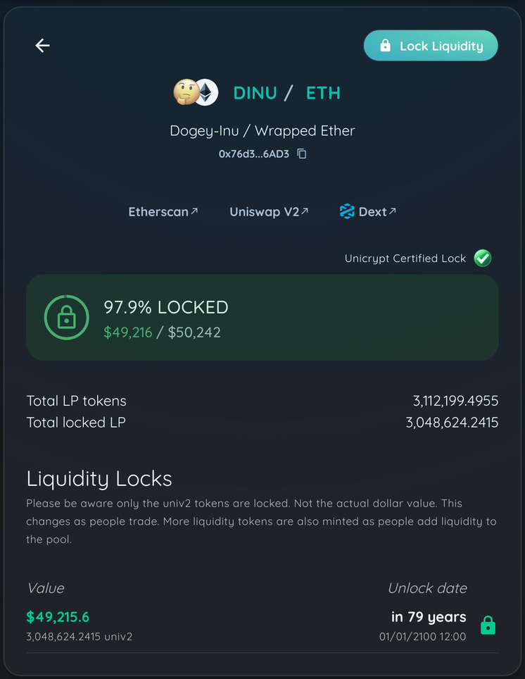Introducing Dogey-Inu's secure locked liquidity strategy – we launched with a minimal 0.01 ETH paired against 50% of our total supply, establishing a near-zero starting valuation for ultimate growth potential.In the world of cryptocurrency, trust should never be taken for granted. Instead of relying on claims of "burned" keys or discarded seed-phrases, we believe in the power of smart contracts that enable permanent liquidity pool locking for unmatched security.The Dogey-Inu team is committed to preventing common scams seen in the small-cap token market, such as projects that build value only to withdraw all liquidity, leaving investors stranded with unsellable tokens. That's why we've locked our LP tokens for a staggering 79 years, ensuring long-term stability and peace of mind for our community.Join Dogey-Inu, and invest with confidence, knowing that our secure liquidity strategy provides a solid foundation for growth, prosperity, and the unwavering support of our dedicated community.PROOF